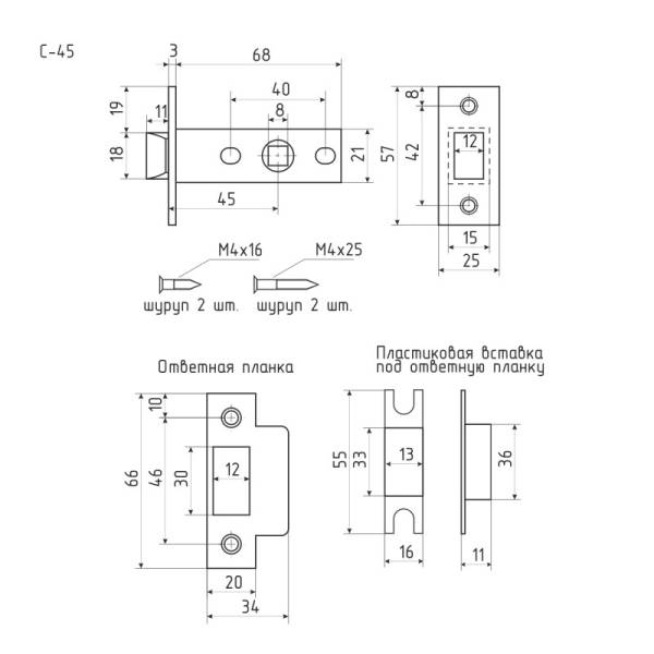 Технические характеристики защелки С-45 Нора-М: размер отверстия под квадрат 8х8; запорные элементы - собачка; ответная планка есть; размер 50 мм; материал корпуса защелки - сталь.
