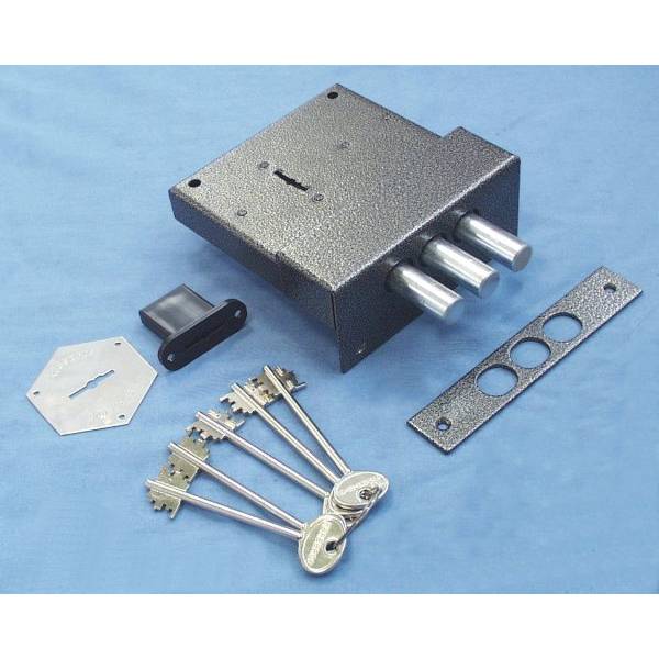 Замок накладной KERBEROS восьмисувальдный, усиленный, имеет защиту от высверливания. Количество секретов - 5 000 000. Вылет засовов - 40мм. Габариты дверного замка: 130х135х22мм. Примечание: Модернизированная версия дверного замка 110.11.001. Усиленное крепление засовов.