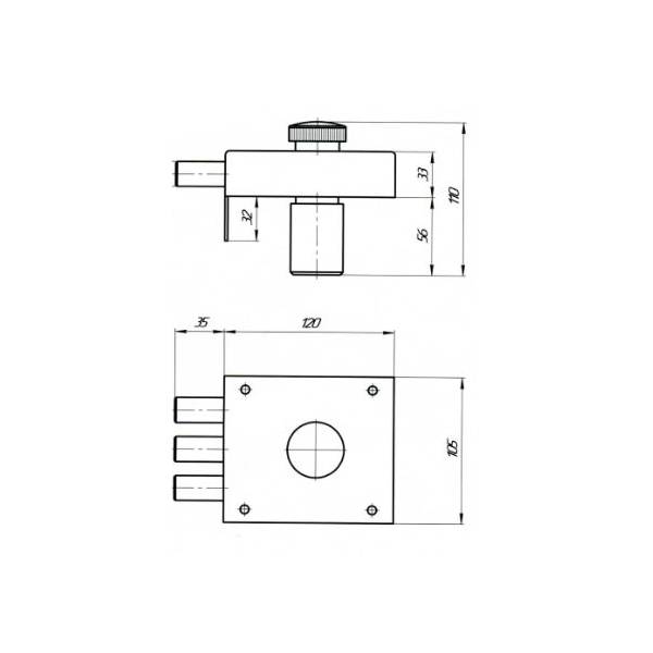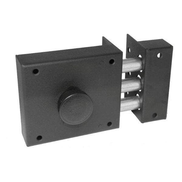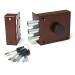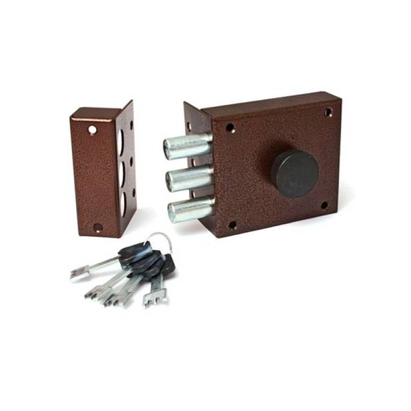 Технические характеристики помпового замка: Накладной замок универсальный с нажимным 8-сувальдным несимметричный механизмом повышенной секретности. Количество ригелей 3. Ход ригелей 30 мм. Корпус замка толщиной 2,5 мм. Условная защелка, 2 ответные планки. Раздельная система запирания "ригель - секрет".