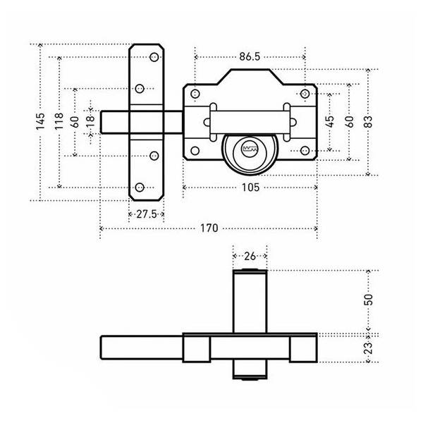 Мощный и цельный стальной засов квадратного сечения 18х18 мм, максимальный вылетом засова 67 мм. Ригель стальной прямоугольный. Удаление ключевого отверстия 45 мм.
