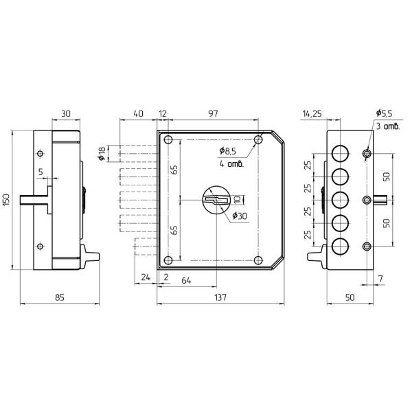 Габаритные размеры корпуса дверного замка: 150х137х30 мм;