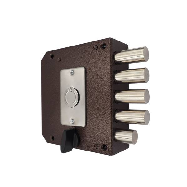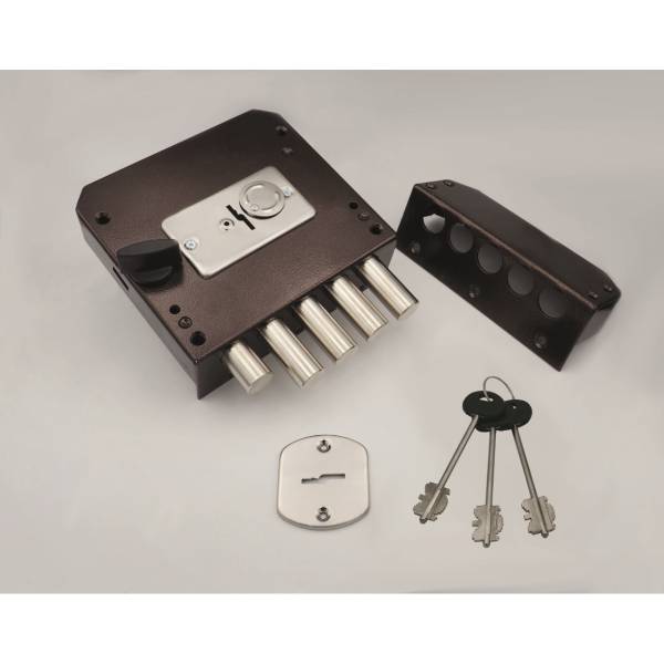 Замок запирает дверь пятью стальными ригелями и задвижкой.