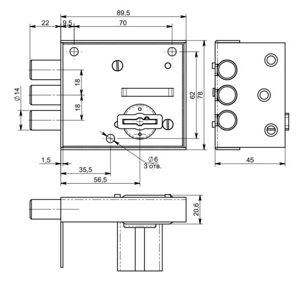 Габариты корпуса замка 89,5х78х20,6 мм.