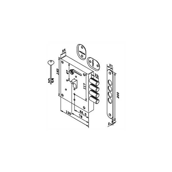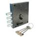 Замок накладной сувальдный гаражный Керберос (накладной KERBEROS) 131.11.003 с дополнительной защитой от высверливания (бронекрышка). Рекомендован для установки в металлические гаражные двери. 4 круглых ригеля диаметром 16 мм с ходом 33 мм. Количество комбинаций механизма замка секретности - 16 777 216. Толщина двери на которую можно устанавливать дверной замок - до 53 мм. Габариты замка - 135х160х25 мм. В комплекте 3 сувальдных ключа,запорная планка, накладки и крепеж. ВНИМАНИЕ! Замок накладной имеет два ключевых отверстия. Первое предназначено для перемещения ригелей (отсутствует механизм секретности). Второе предназначено для блокировки ригелей и первого ключевого отверстия. ВАЖНО: Закрывая двернозамок, обазательно заблокируйте ригели при помощи второго ключевого отверстия с секретом.