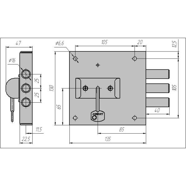 Габариты корпуса замка 130х135х24 мм.