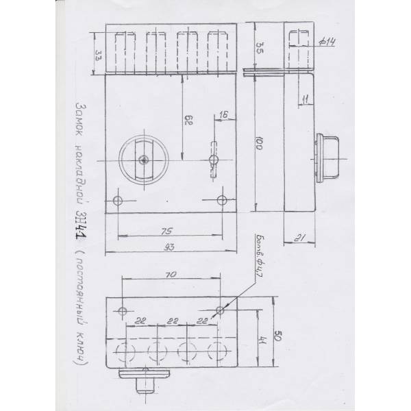 Накладной замок модель ЗН-4-1П имеет 4 запорных стержня, диаметр стержней D 14 мм;
