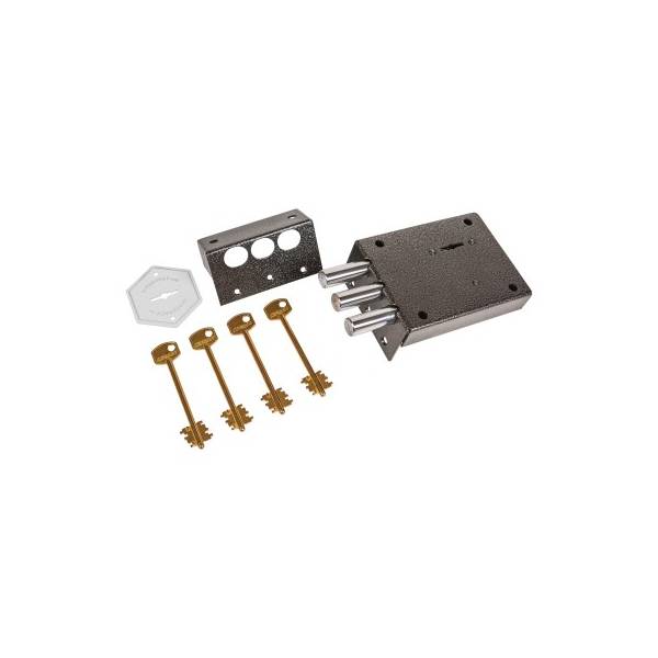 Технические характеристики: Защитная конструкция корпуса замка, универсальное открывание, 3й класс защиты замка; Материал корпуса - сталь, покрытие - порошковая краска; Цвет корпуса металлик. Цилиндрические ригели, диаметр ригелей 16 мм, вылет ргеля 40 мм, количество ригелей 3. Удаление ключевого отверстия 85 мм.