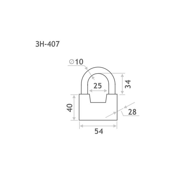 Габариты корпуса ЗН 407-60 Нора-М: высота корпуса 40 мм, ширина 54 мм, высота дужки 34 мм, диаметр дужки 10 мм (см. чертеж).