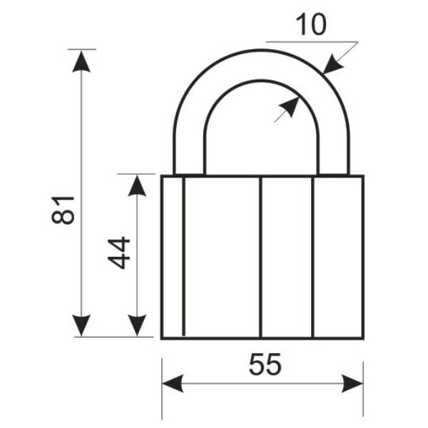 Ширина основания корпуса - 55мм, диаметр дужки 10мм.