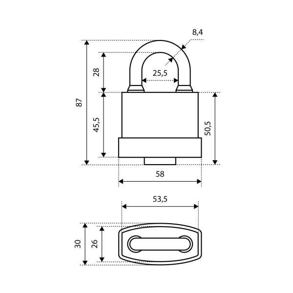 Размеры замка ВС1Ч-375П Аллюр: Диаметр дужки 8 мм; Ширина корпуса 58 мм; высота корпуса 47 мм; высота проема дужки 28 мм.