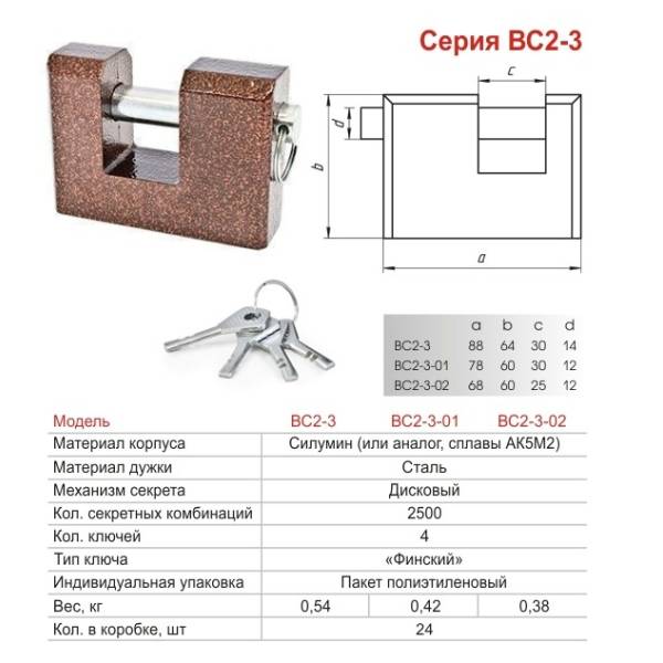 Размеры ВС2-3-01: корпус 68х60 мм. Диаметр дужки 12 мм. Проем дужки 30 мм. Более точная информация - см. чертеж ВС2-3-01 или запросите в отделе продаж.