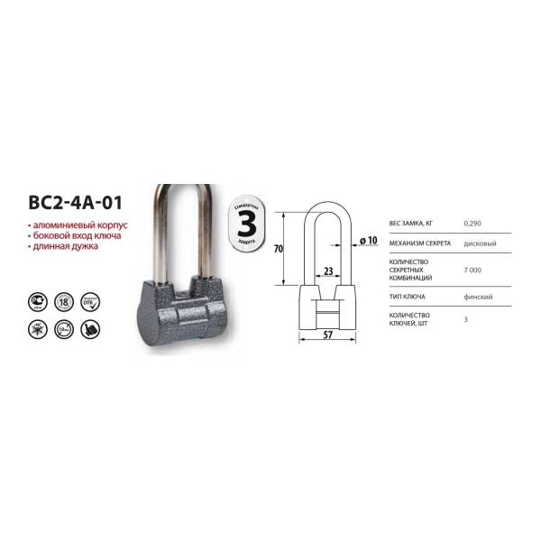 Замок ВС2-4А-01 отличается от модели ВС2-4А удлиненной дужкой.