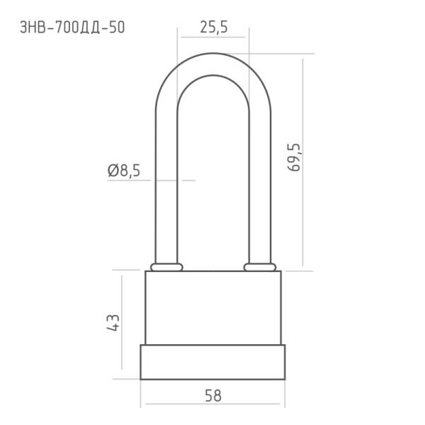 Технические характеристики: корпус из стальных оцинкованных пластин в пластиковом кожухе. Автоматическое запирание без ключа. Материал цилиндра - латунь. Размер корпуса: ширина 58 мм, высота 43 мм. Высота дужки 69,5 мм, ширина проема дужки 25,5 мм, диаметр дужки 8,5 мм.