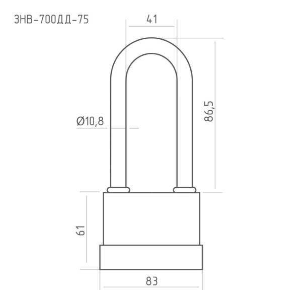 Технические характеристики: корпус из стальных оцинкованных пластин в пластиковом кожухе. Автоматическое запирание без ключа. Материал цилиндра - латунь. Размер корпуса: ширина 83 мм, высота 61 мм. Высота дужки 86,5 мм, ширина проема дужки 41 мм, диаметр дужки10,8 мм.