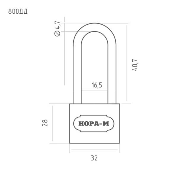 Технические характеристики ЗН-800дд 32 мм Нора-М: ширина корпуса 32 мм, высота корпуса 28 мм, высота дужки 40,7 мм, ширина проема дужки 16,5 мм, диаметр дужки 4,7 мм.