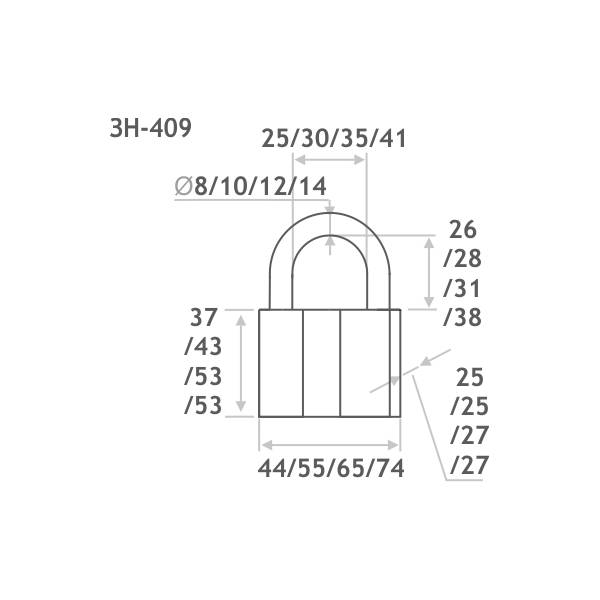 Модель навесных замков ЗН-409 Нора-М выпускается в 4 размерах: 50, 60, 70 и 80 мм.