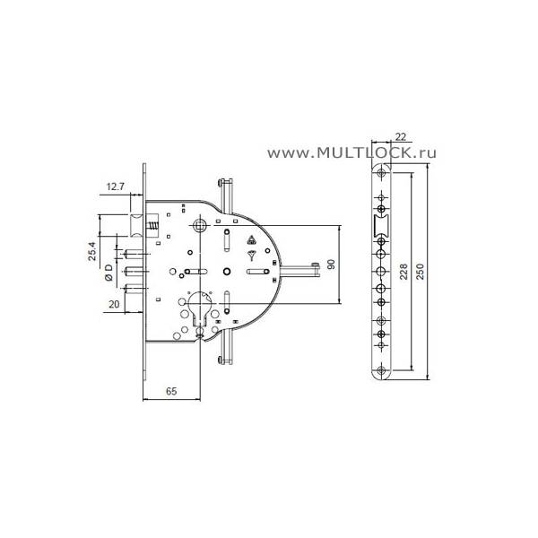 Технические характеристики: Механизм имеет схему прямого геометрического запирания и защиту от силового складывания, посредством давления на один из каналов. Цилиндры, необходимые для комплектации данного замкового механизма должны иметь рабочий элемент - шестеренку. Удаление ключевого отверстия 65 мм, межосевое расстояние 90 мм.