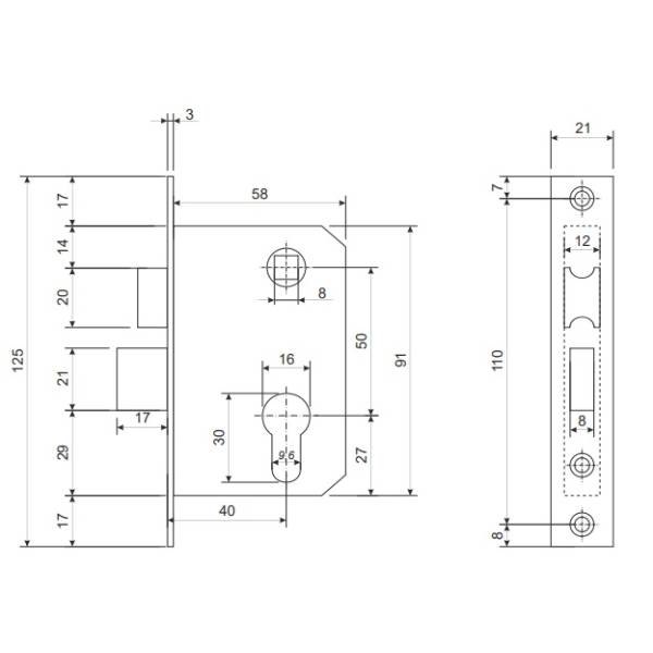 Технические характеристики: удаление ключевого отверстия 40 мм, межосевое расстояние 50 мм; вылет ригелей 16 мм, комплектуется цилиндром 60 мм, 5 ключей.