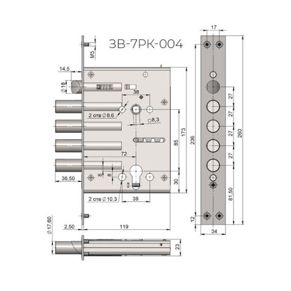 Врезной замок Крит ЗВ-7РК-003-Хп универсального открывания удаление ключевого отверстия 72 мм, межосевое расстояние 85 мм.