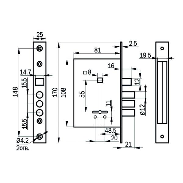 Замок врезной 8-сувальдный с защелкой и фалевыми ручками. Предназначен для установки в двери толщиной 40-50 мм. Замок универсальный, его можно устанавливать как в правые, так и в левые двери, переустановив защелку. Комплектуется 3/5 стальными ключами. Покрытие корпуса замка ? цинковое. Покрытие лицевой и ответной планок ? никелевое. Замок имеет защиту от высверливания. Изготовлен из высокопрочных материалов. Имеет защитное покрытие. Фурнитура к дверному замку: РФ.61, РФ33, HP-002. 8-сувальдный, 250000 секретов, вылет ригелей ? 21 мм, диаметр ригеля ? 11,7 мм, количество ключей ? 3/5, габаритные размеры 81х108х19, защита от отмычек. Модель ЗВ 9-8/13 СП2.РФ61-022.Ш. Длина ключа кол- во ? 70/3. Накладки с фалевыми ручками, покрытие "черный жемчуг". Кол-во в транспортной упаковке/вес(кг) ? 9/13,55.