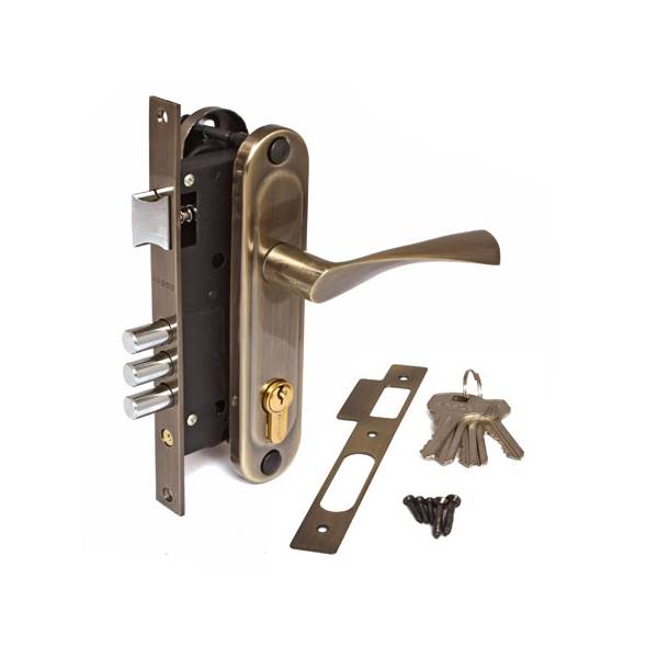 Замок Апекс 1523 комплектуется ручками и цилиндром. Материал ручки алюминий; Покрытие ручек гальваническое; Цвет покрытия бронза.