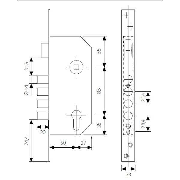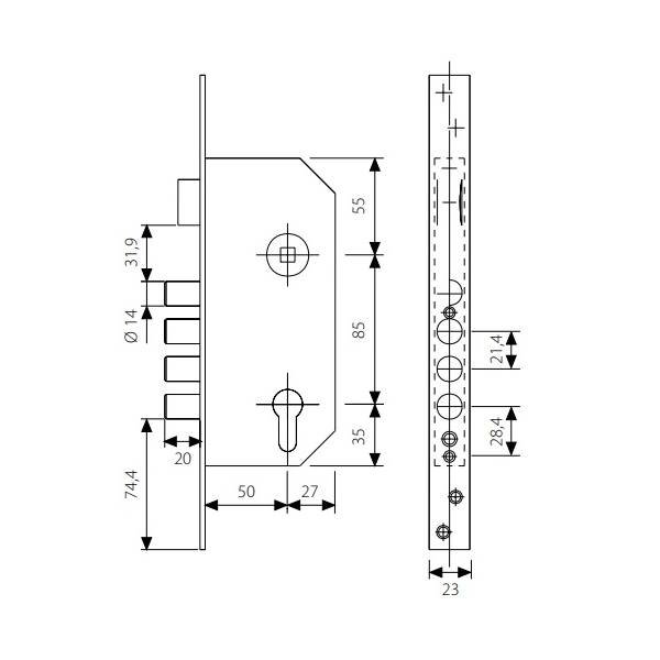 Технические характеристики ЗВ R100B5SSE Tesa: четырехригельный механический замок; удаление ключевого отверстия (бэксет) 50 мм; межосевое расстояние 85 мм; комплектация - корпус замка, без ручек, без цилиндра. Длина торцевой планки 270 мм.