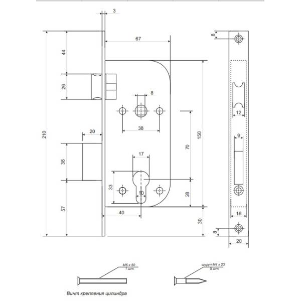 Технические характеристики: Тип крепления врезного замка лицевая планка; Тип ригелей классический/прямоугольный; Вылет ригелей 20; Удаление ключевого отверстия (Backset) 40 мм; Тип механизма секретности цилиндровый; Тип цилиндрового механизма евроцилиндр; Тип ключа английский; Количество ключей (врезные замки, кнобы) 5; Цилиндром комплектуется; Размер цилиндра 30/30; Материал цилиндра латунь; Покрытие цилиндра гальваника; Цвет цилиндра хром; Защелка классическая; Межосевое (врезные замки, ручки на планке, ручки-скобы) 70 мм; Ручками комплектуется; Способ установки ручки (врезные замки) саморезы; Материал ручки алюминий; Покрытие ручек анодирование; Цвет ручки никель; Запирание не автоматическое; Количество точек запирания 1; Покрытие лицевой планки (врезные замки, защелки) гальваника; Цвет лицевой планки (врезные замки, защелки) никель; Тип защелки универсальная.