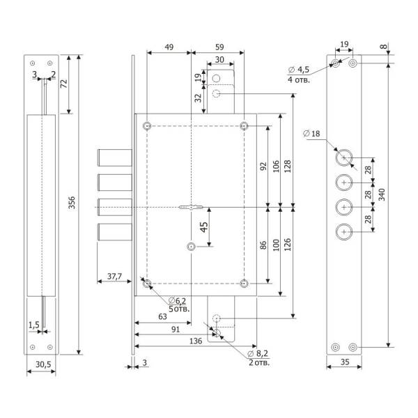 четырехригельный корпус замка; ригели цилиндрические, диаметром 18 мм, вылет ригелей 37,7 мм;