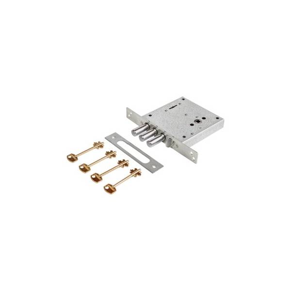 Тип механизма сувальдный(8 сувальд); Количество комбинаций более 100 000; Толщина полотна двери 40-50 мм; Длина ключа 30*/45/60* мм; Количество полуоборотов 4; Количество ключей 4. С наружной и внутренней стороны открывается одинаковыми ключами. Замок без переналадки устанавливается на правые и левые двери. Доступны различные варианты комплектации: с российскими ключами; с итальянскими ключами; с запорной планкой; без запорной планки.