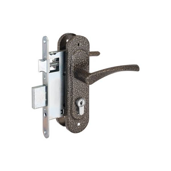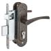 Материал корпуса замка сталь, материал засова и защелки цинковый сплав, материал ручек алюминиевый сплав, материал накладок сталь.