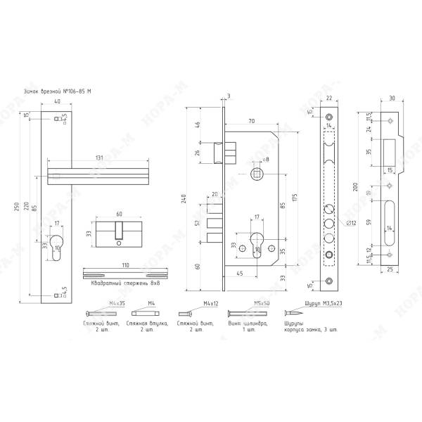ЗАМОК ВРЕЗНОЙ 106-85М Нора-М - замок с ручками для входных или межкомнатных дверей. Производитель Нора-М, страна производства Россия-Испания.