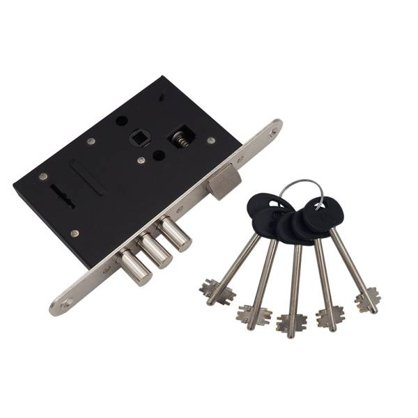 Замок комплектуется стальной лицевой планкой, а также тремя или пятью (по желанию заказчика) латунными ключами с пластиковой головкой.