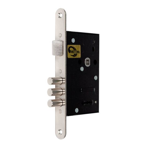 ЗВ9 902 Меттэм имеет одно направление запирания - тремя стальными ригелями диаметром 12 мм, которые выдвигаются из корпуса замка на 22 мм. Запирание происходит на 2 (два) полуоборота. Модель ЗВ9 902.0.0 оснащена защёлкой, что позволяет использовать этот замок в качестве основного запирающего устройства.