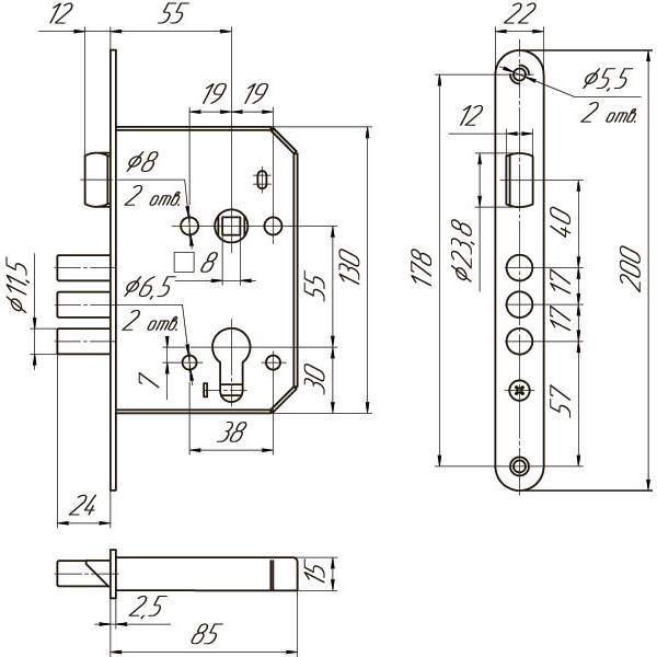 Габаритные размеры корпуса замка 200х85х22 мм.