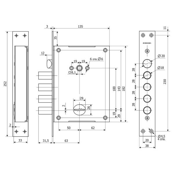 Замок врезной ЗВ "Гардиан 40.11" QUATTRO левый, 2 защелки, 5 кл.