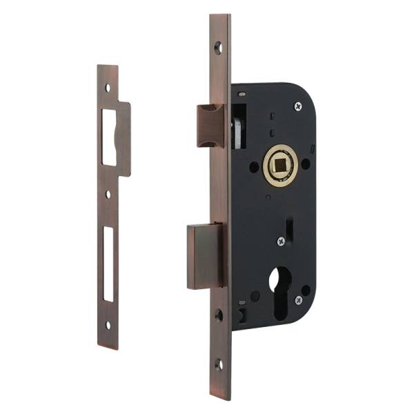 Корпус врезного замка Нора-М КЗВ-100 одноригельный под цилиндровый механизм межосевое 70 мм бэксет 40 мм старая медь универсальный.