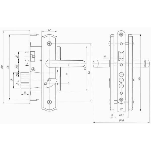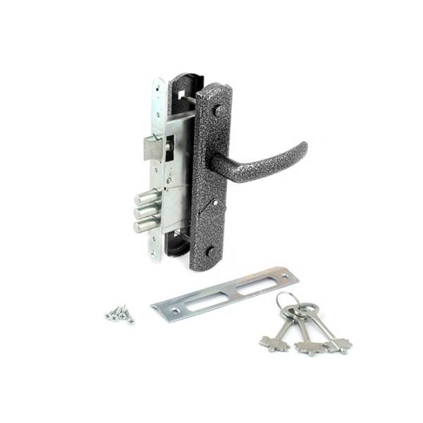 Комплектация: корпус замка, ручки на планке, квадрат, крепеж, цилиндровый механизм 60 мм, ответная планка.