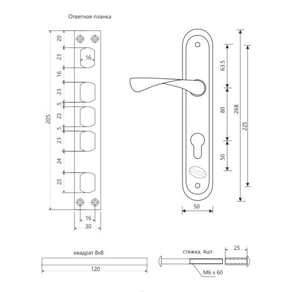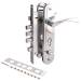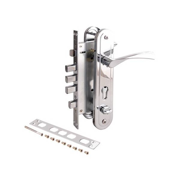 Три круглых ригеля с ходом 24 мм, приводятся в действие цилиндровым механизмом, защелка приводится в действие фалевой ручкой и ключом.