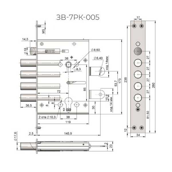 Представленный замок оснащен засовом, который состоит из четырёх штырей, обладающих диаметром 17,6 мм.