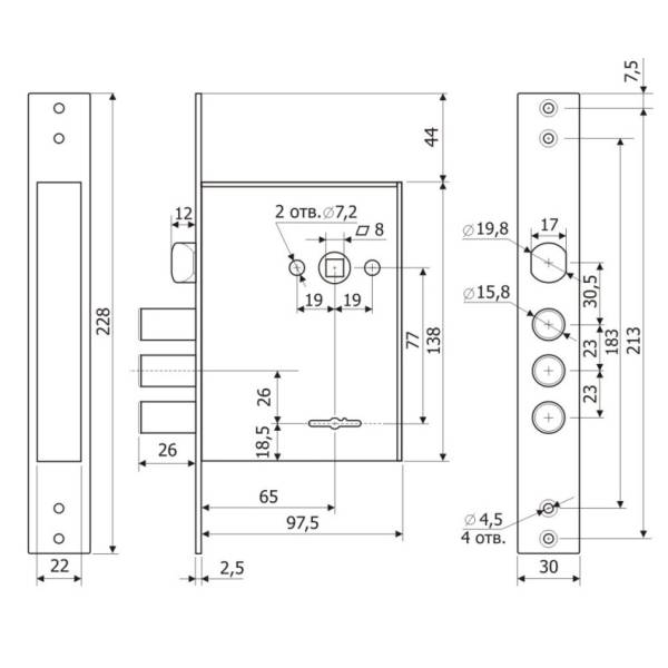 Замки Гардиан 30.01, Гардиан 30.04 и Гардиан 30.11 врезные восьмисувальдные имеют засов из 3х стержней круглого сечения даиметром 15,8 мм с максимальным выдвижением за один полный оборот ключа 26 мм.