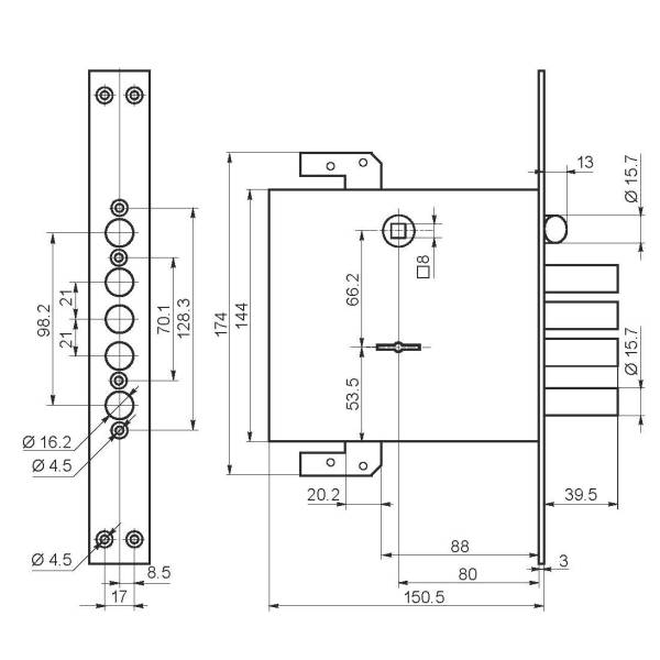 Замок врезной БОРДЕР 71611 ЗВ 8-8 К.5Т/15 (КСП2-88) ЛП8.БР.П.В17,5 (71611) - корпус замка без ручек с тягами, универсальный, 5 ригелей.