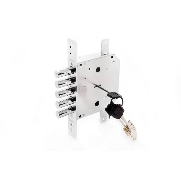 Корпус замка врезной верхний с тягами. Количество сувальд 6; Количество штырей 5; Количество комбинаций 120 тысяч; Длина ключа 102 мм; Материал ключа латунный с пластиковой головой; Модель дверного замка левый; Количество ключей 5; Тип механизма секретности сувальдный;