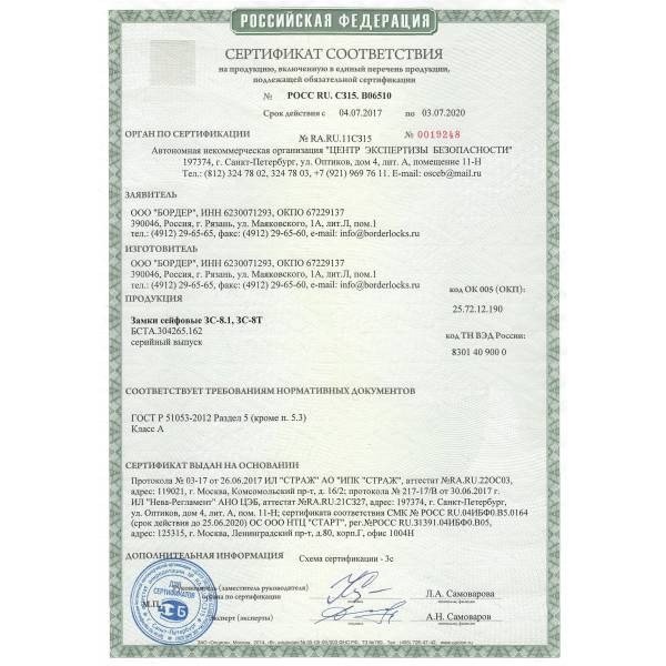 Врезной замок Бордер 73143 имеет сертификат соответствия классу А сейфовые замки.