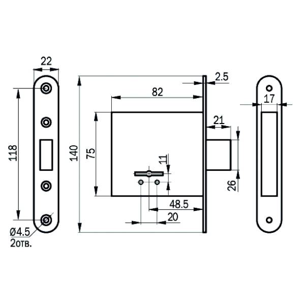 80500 Замок врезной ЗВ8-6/0 (медь, прямой риг, 3 ключа) ПроСам