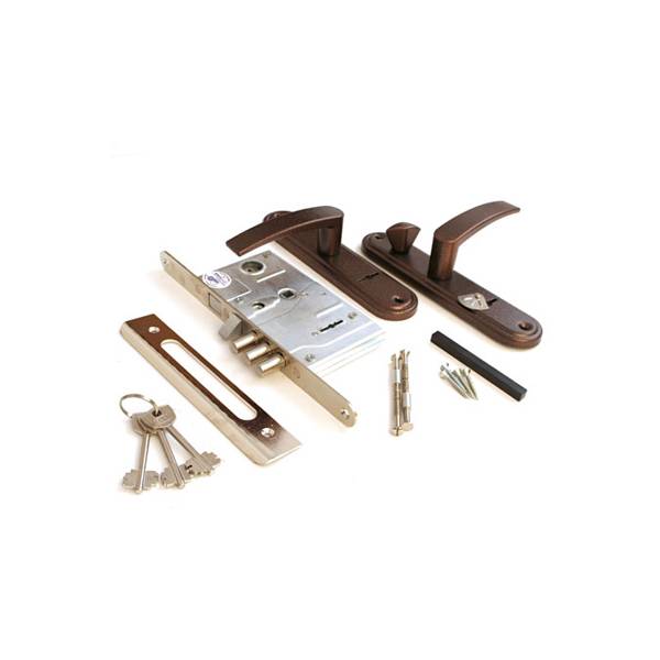 Замок врезной 8-сувальдный с защелкой, задвижкой и фалевыми ручками. Предназначен для установки в двери толщиной 40-50 мм. Выпускается отдельно на правые и на левые двери. Комплектуется 3 стальными ключами. Замок дверной открывается и закрывается изнутри и снаружи ключом. Дверь может быть закрыта на защелку и открыта с помощью фалевой ручки при открытом сувальдном механизме. С внутренней стороны дверной замок может закрываться на задвижку. Покрытие корпуса замка ? цинковое. Покрытие лицевой и ответной планки ? никелевое. Замок дверной имеет защиту от высверливания. Изготовлен из высокопрочных материалов. Имеет защитное покрытие. Модель ЗВ 9-8.3/13 ЗП.РФ46Л-002.Ш. Накладки с фалевыми ручками "медный антик". Длина ключа/кол- во ? 70/3. Количество в транспортной упаковке/вес(кг) ? 9/14,47.