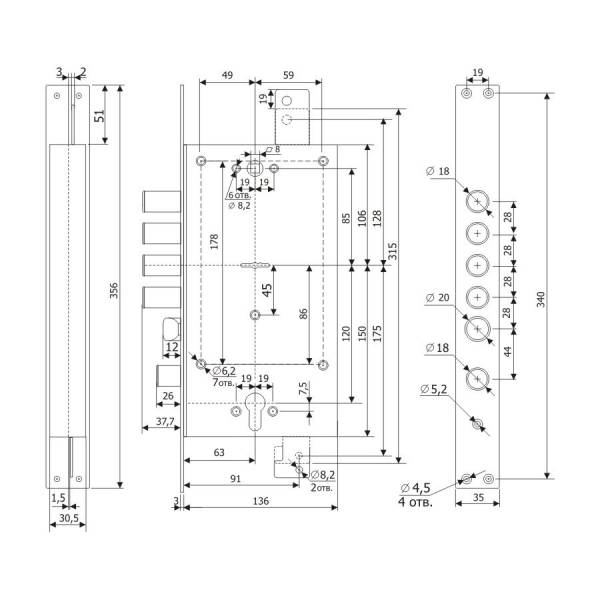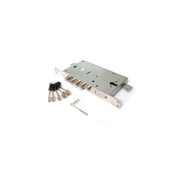 Технические характеристики: Корпус врезной под фалевые ручки, комбинированный механизм секретности под цилиндровый и сувальдный механизм. Ригели цилиндрические. Количество ригелей 5. Вылет ригелей 37,7 мм. Межосевое расстояние 85 мм. Удаление ключевого отверстия (Backset) 63 мм; Механизм секретности замка сувальдный; Количество точек запирания 3; Классическая универсальная защелка;