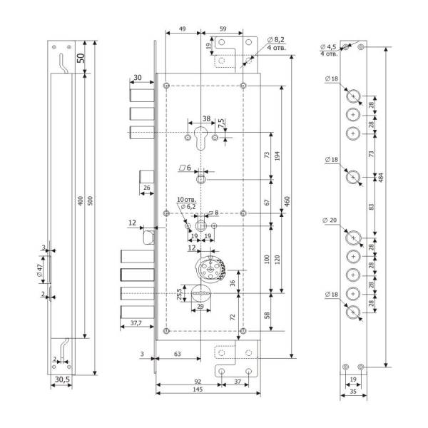Посадочные и установочные размеры: корпус замка 400х145х32,5 мм; Удаление ключевого отверстия (Backset) 63 мм. см. чертже Гардиан 2514 на втором фото.
