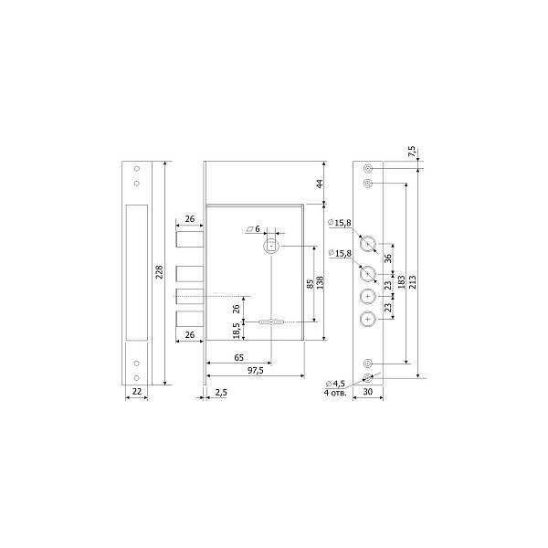 Посадочные и установочные размеры корпус замка 138х97,5х22 мм;