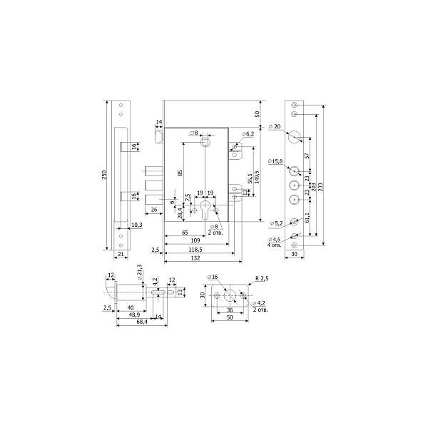 Технические характеристики ЗВ 33.11: Тип механизма замка цилиндровый; трехригельный; тип ригелей цилиндровые (круглые); количество ригелей 3; диаметр риегелей 15.8 мм; вылет ригелей 26 мм; в комплекте 2 защелки. Количество комбинаций в зависимости от цилиндрового механизма; Толщина полотна двери для установки ЗВ 33.11 от 40 до 75 мм; Количество оборотов 2; Масса дверного замка 1.12 кг. Замок закрывается на 2 оборота. Габариты корпуса ЗВ 33.11 Гардиан - на чертеже.