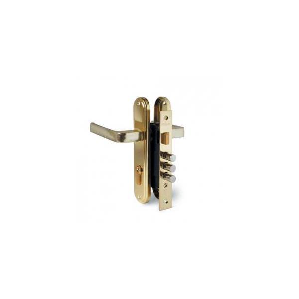 Замок врезной Apecs 1026/60-G в комплекте с ручками на планке и цилиндровым механизмом.